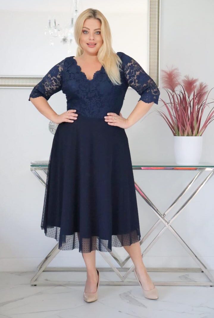 Sukienka Pisla rozkloszowana elastyczna koronka koło z tiulu granatowa