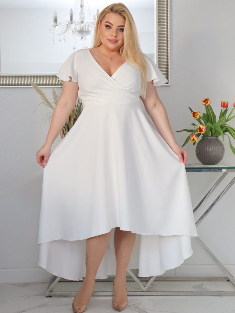 Sukienka Soraja asymetryczna rozkloszowana ekskluzywna kopertowy dekolt ecru biała WYPRZEDAŻ !