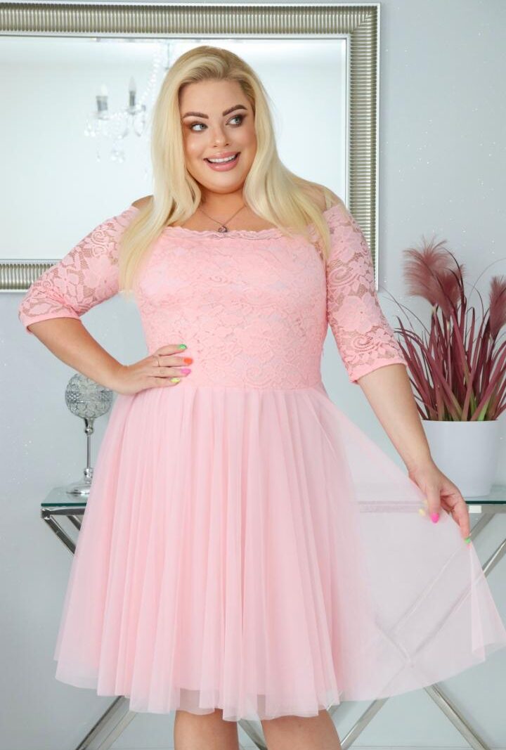 Sukienka Femm rozkloszowana koronkowa góra i tiulowy dół pudrowy róż PROMOCJA