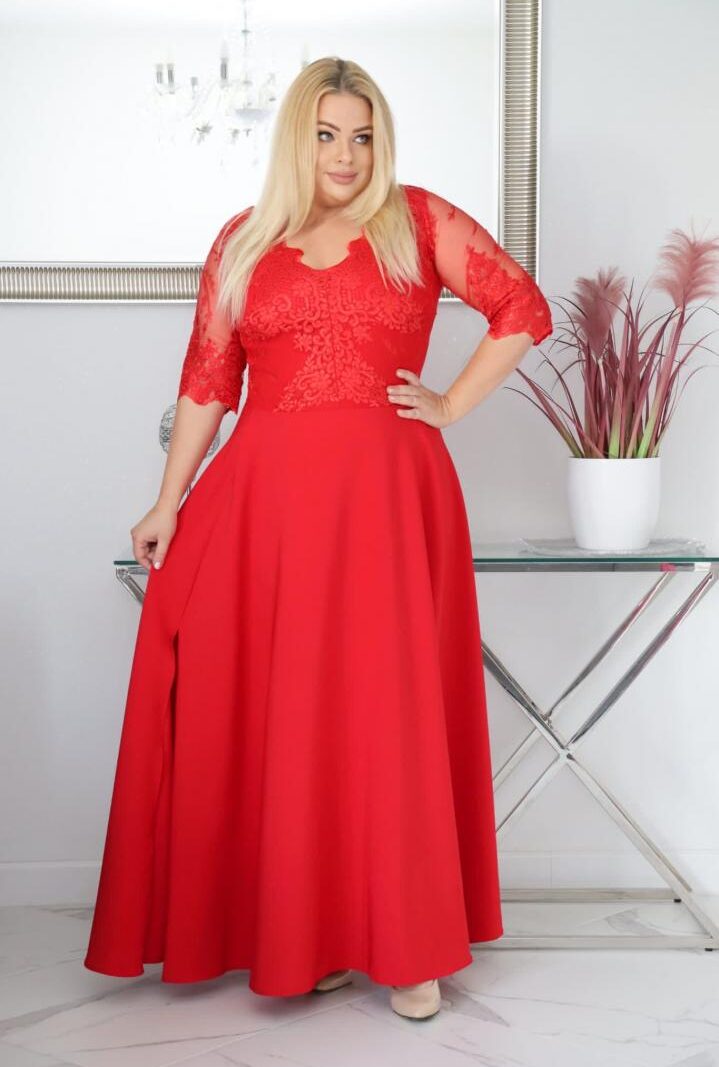 Sukienka Claudia maxi wieczorowa rozkloszowana ekskluzywna dekolt serek koronka czerwona WYPRZEDAŻ