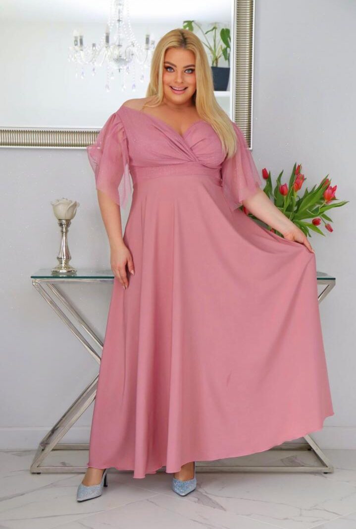 Sukienka Fiorella asymetryczna rozkloszowana kopertowy dekolt koktajlowa koronka kwiatki pudrowy róż popiel WYPRZEDAŻ