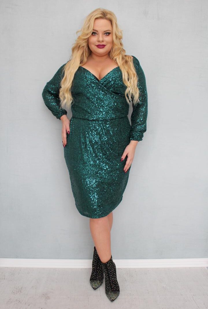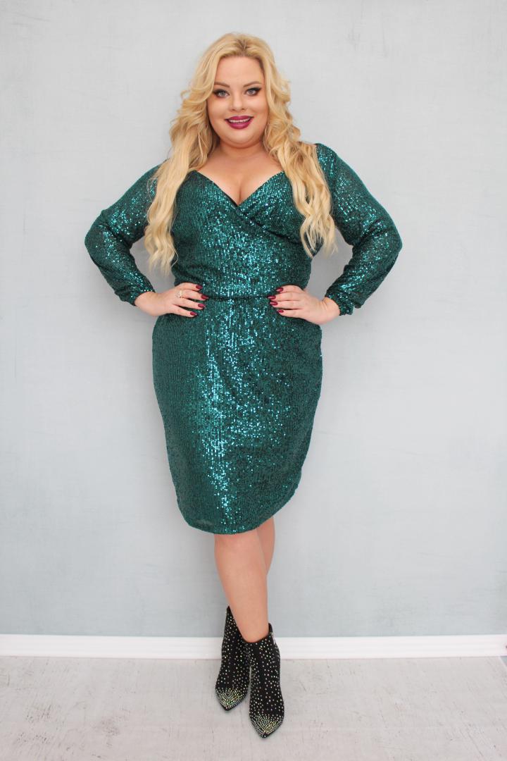 Sukienka Crystal cekinowa kopertowy dekolt CEKINY butelkowa zieleń