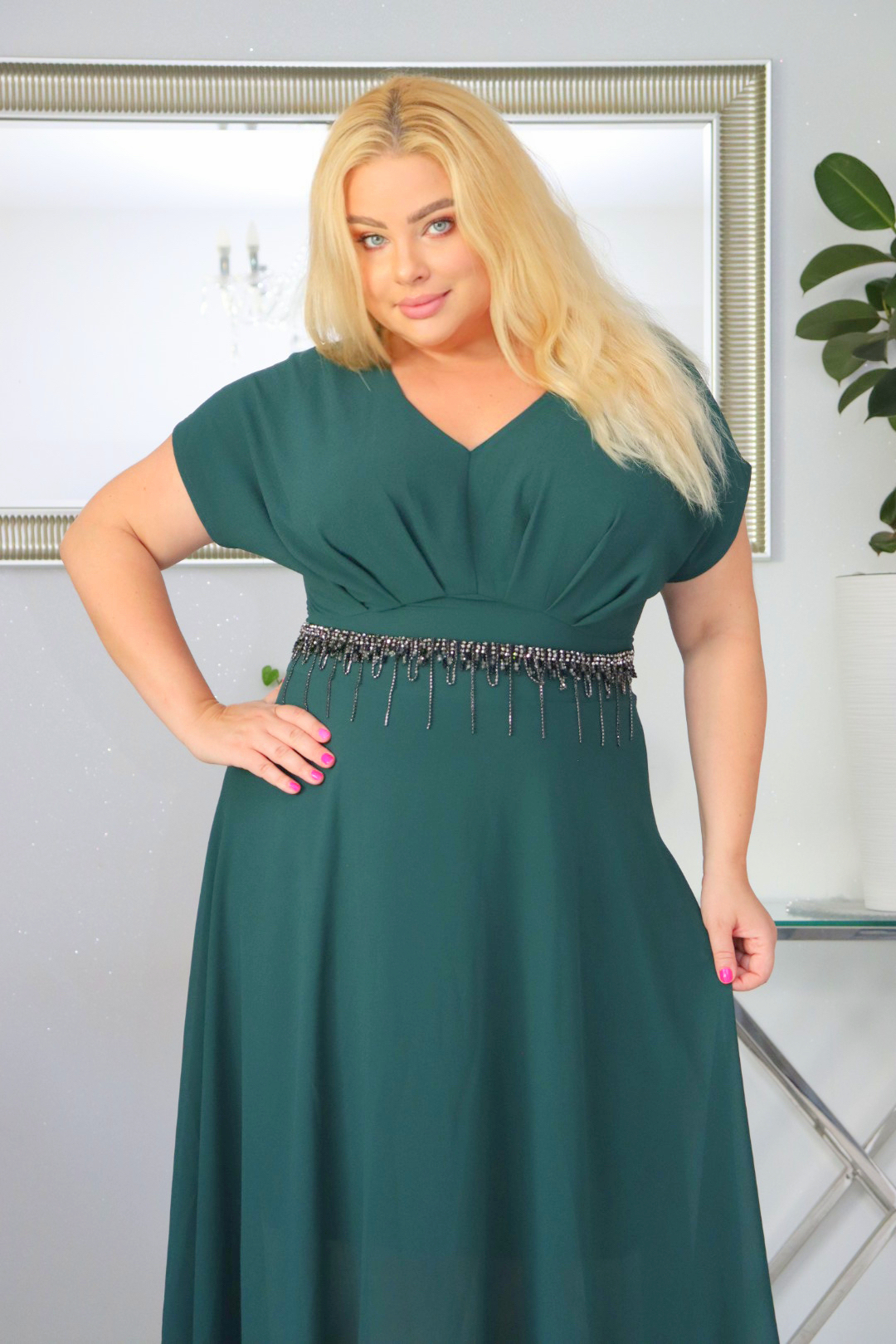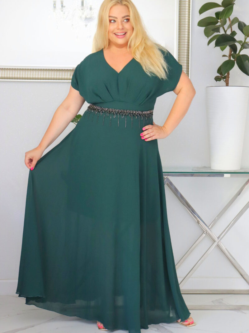 Sukienka Kasjana cekiny frędzle szyfonowe rękawy butelkowa zieleń