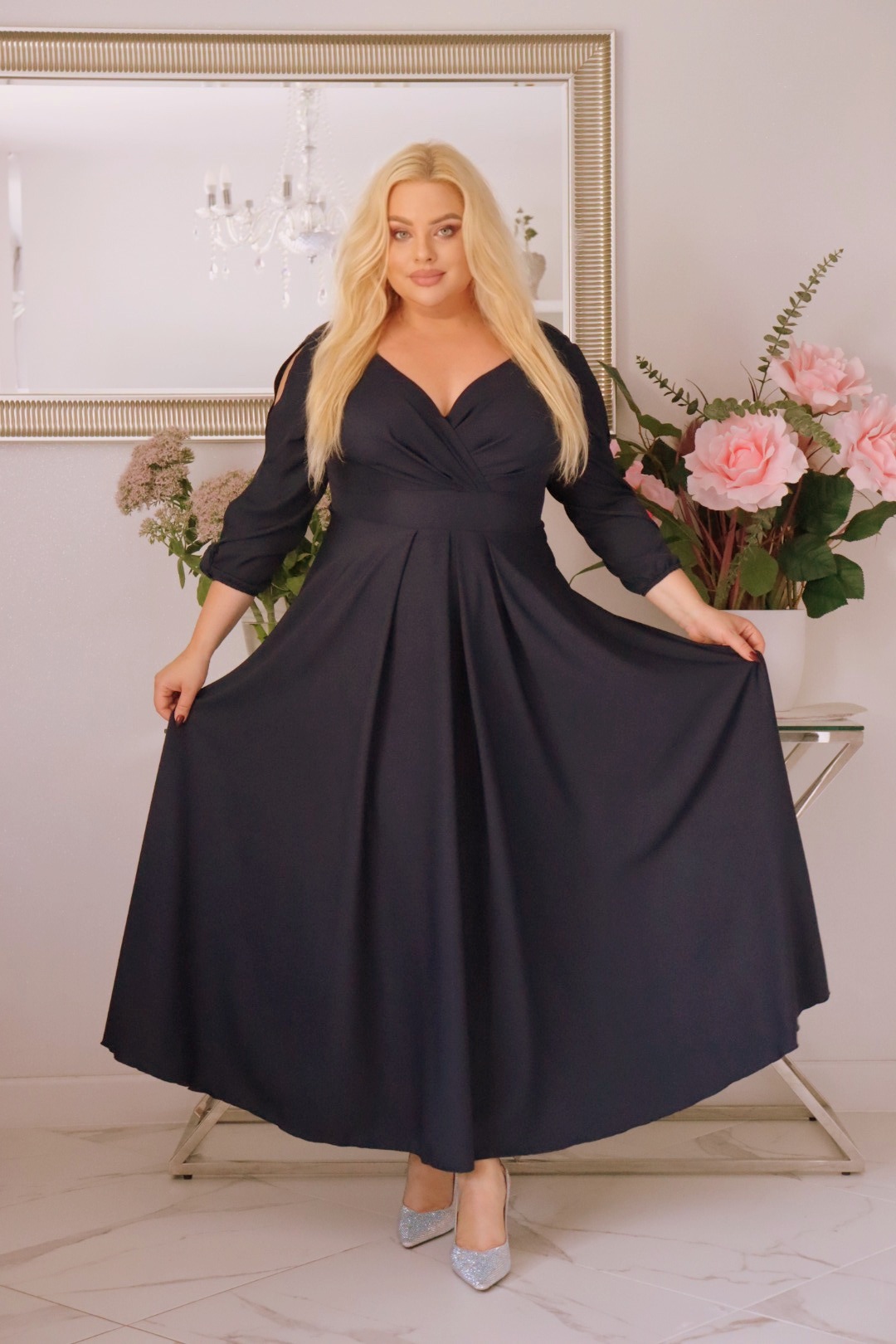 Sukienka klasyczna rozkloszowana z kopertowym dekoltem granatowa gładka. A002. MEGA WYPRZEDAŻ!