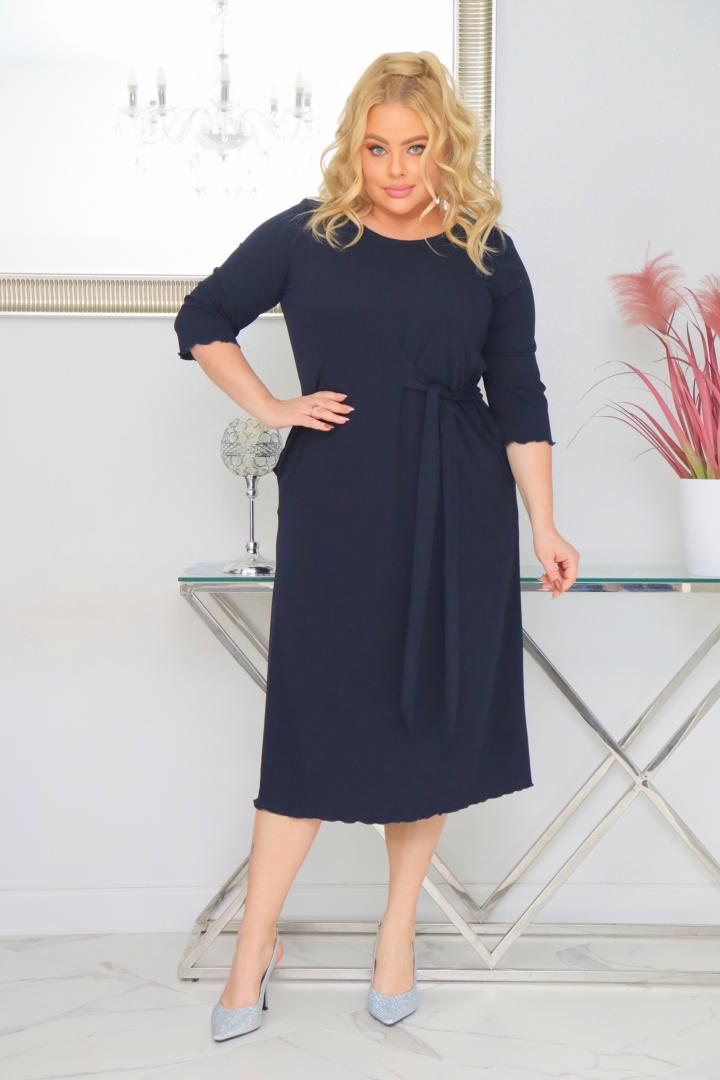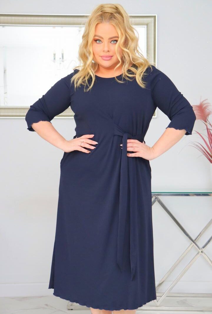 Sukienka Natasza rozkloszowana midi dzianina wiązana w pasie granatowa