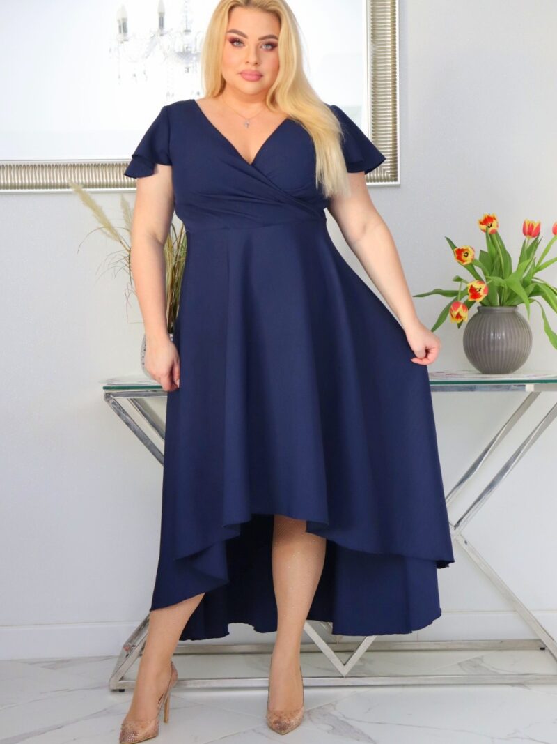 Sukienka Soraja asymetryczna rozkloszowana ekskluzywna kopertowy dekolt granatowa WYPRZEDAŻ !