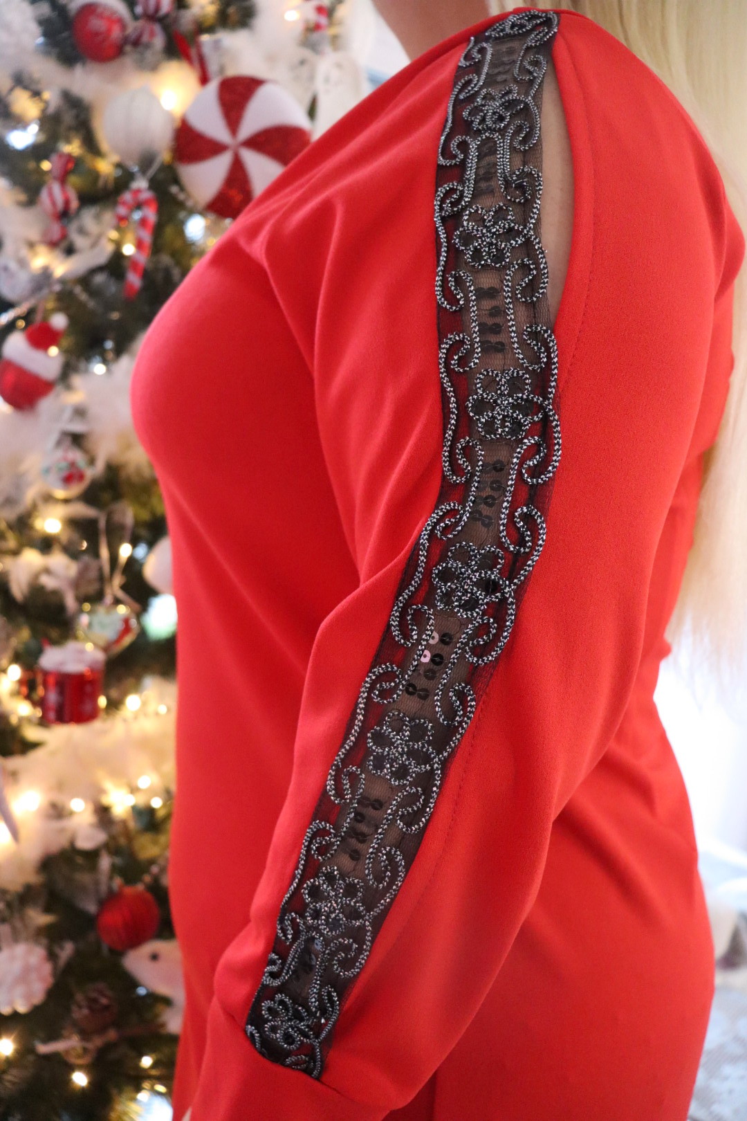 Sukienka Ermina trapezowa rozcięte rękawy ozdobna taśma czerwona