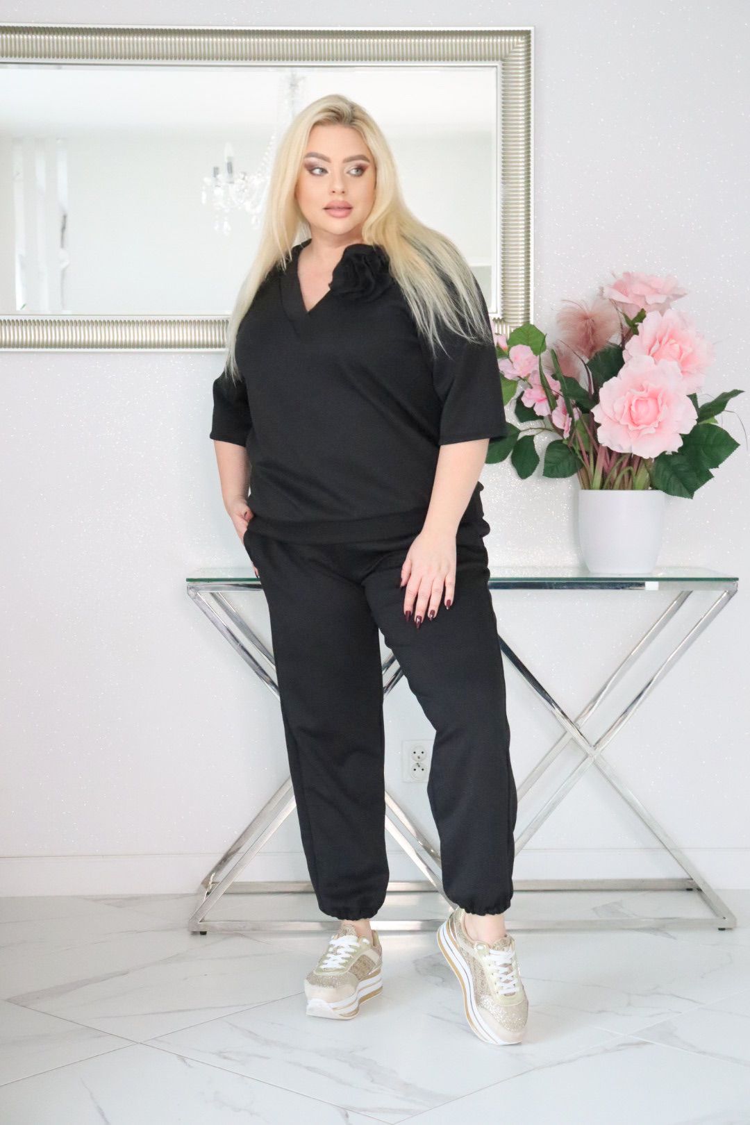 Wykonany z najmodniejszego w tym sezonie, gładkiego dresu, komplet ten wpisuje się w najnowsze trendy mody casualowej. Bluza ozdobiona jest efektowną, przestrzenną różą, która nadaje sportowemu fasonowi nutę subtelnej elegancji. Ten unikatowy detal podnosi rangę dresu, czyniąc go odpowiednim nie tylko do domowego zacisza, ale i na stylowe wyjścia. To połączenie wygody i wysokiego stylu, które z pewnością przyciąga wzrok.