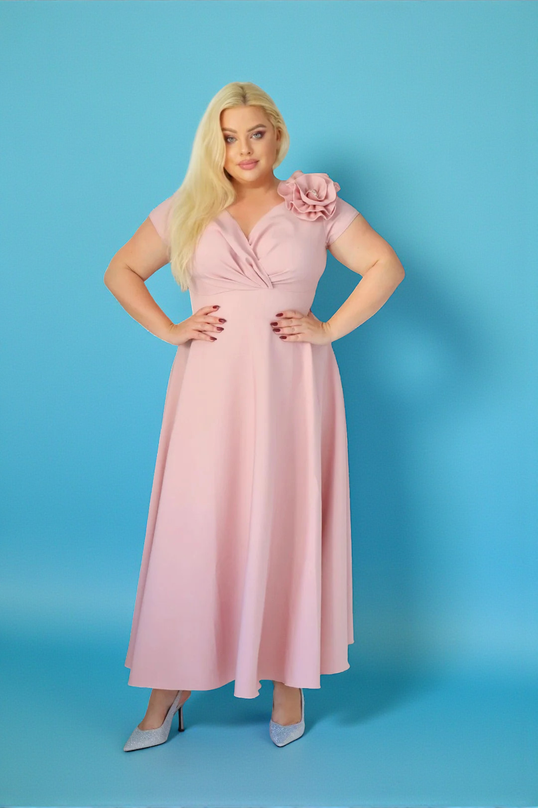 Miękko układający się materiał nie tylko pięknie się układa, ale także optycznie wysmukla sylwetkę. Tkanina w naturalny sposób podąża za kształtem ciała, maskując drobne niedoskonałości. Rozkloszowany fason dodatkowo harmonizuje proporcje, tworząc idealny, klepsydrowy kształt. Dzięki temu w sukience poczujesz się wyjątkowo i pewnie.