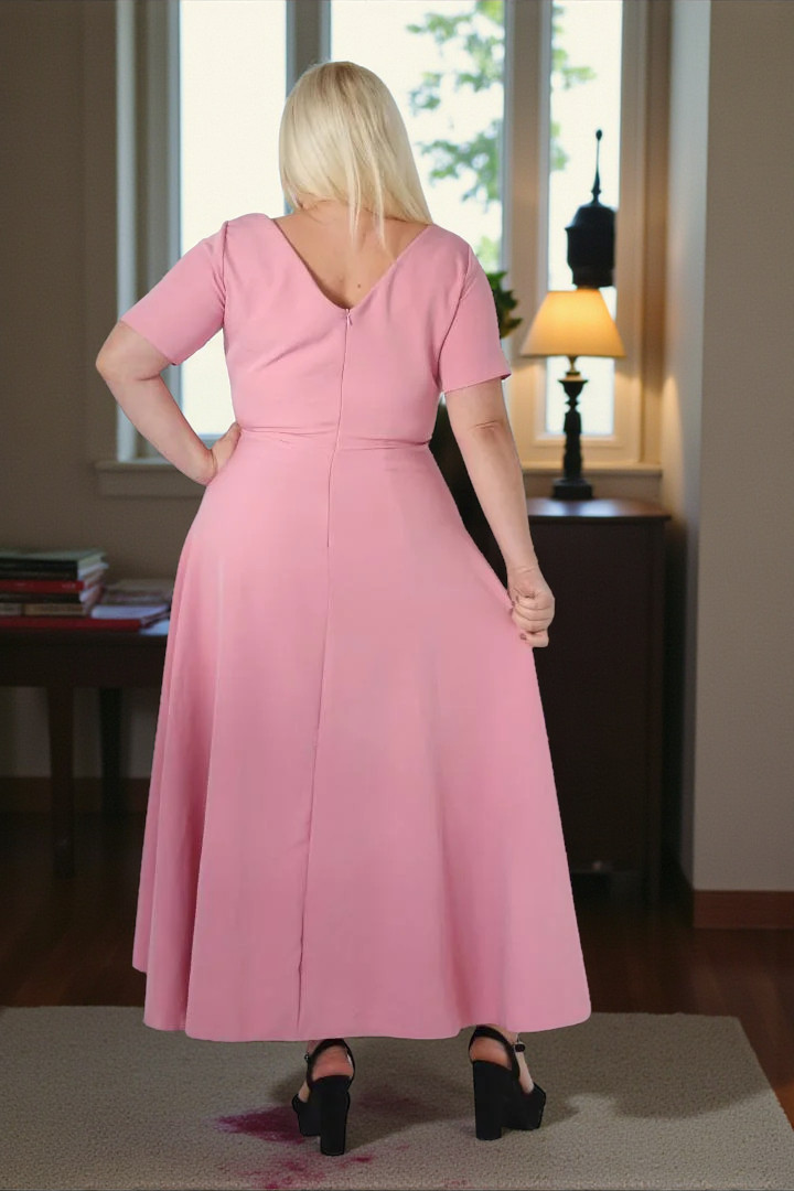 Maxi dół optycznie wyszczupla sylwetkę. Kopertowy dekolt i odcięta góra podkreśla talią i ładnie eksponuje kobiece kształty optycznie wydłużając i wysmuklając sylwetkę.
