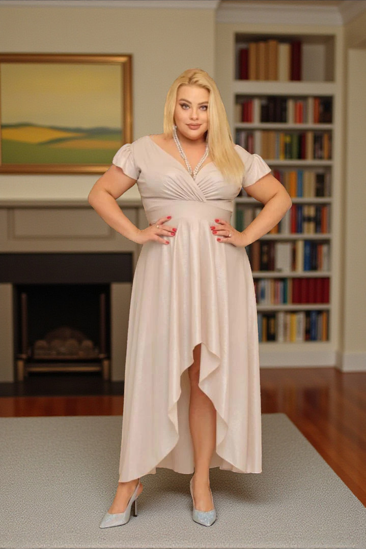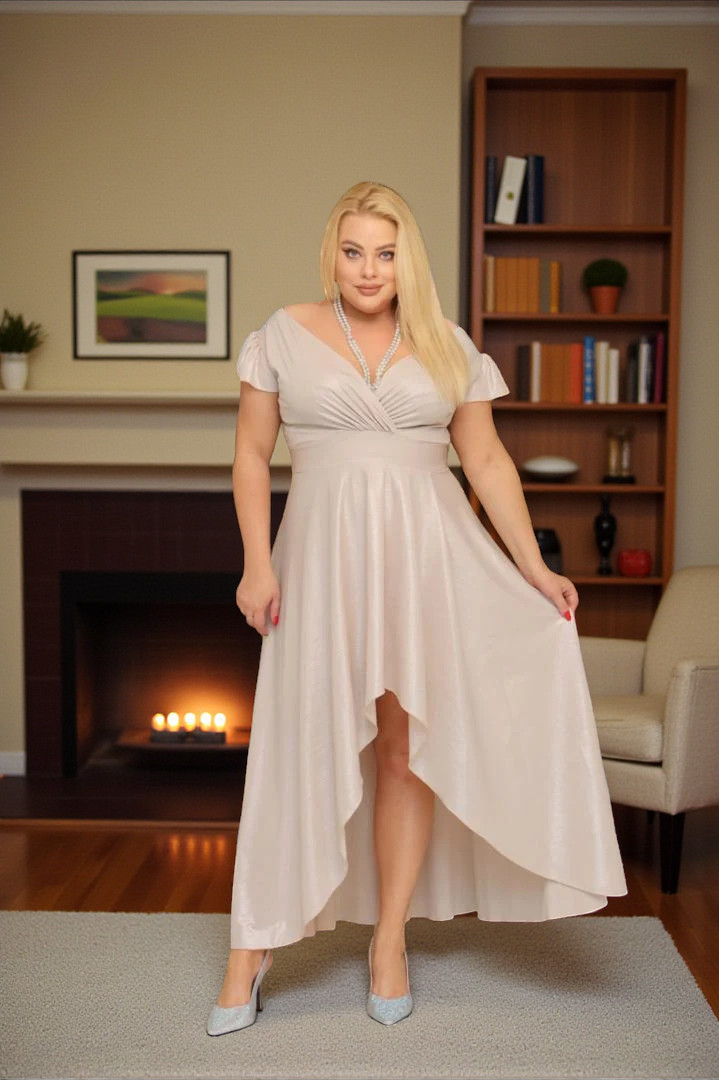 Sukienka idealnie zatuszuje wystający brzuszek. Dół sukienki jest rozkloszowany więc obwód bioder nie jest potrzebny.