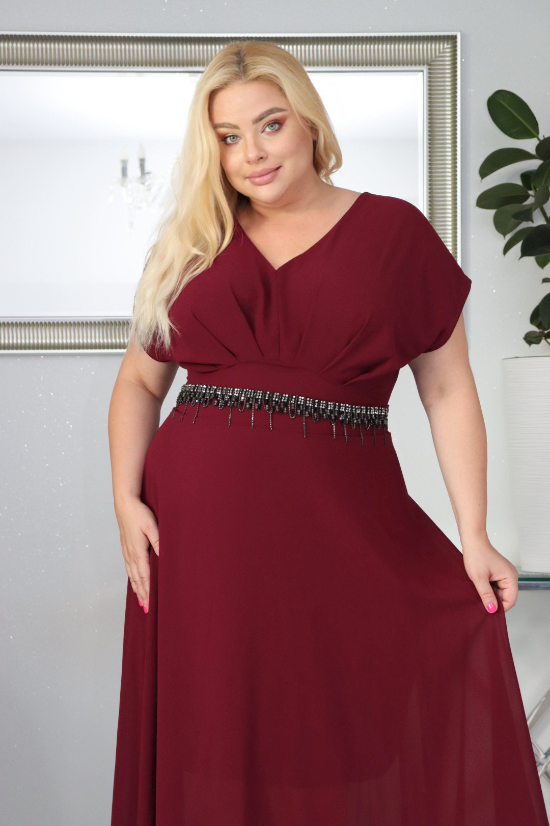 - Sukienka została zaprojektowana, by pięknie tuszować wystający brzuszek, dzięki luźnemu krojowi poniżej odcięcia pod biustem.