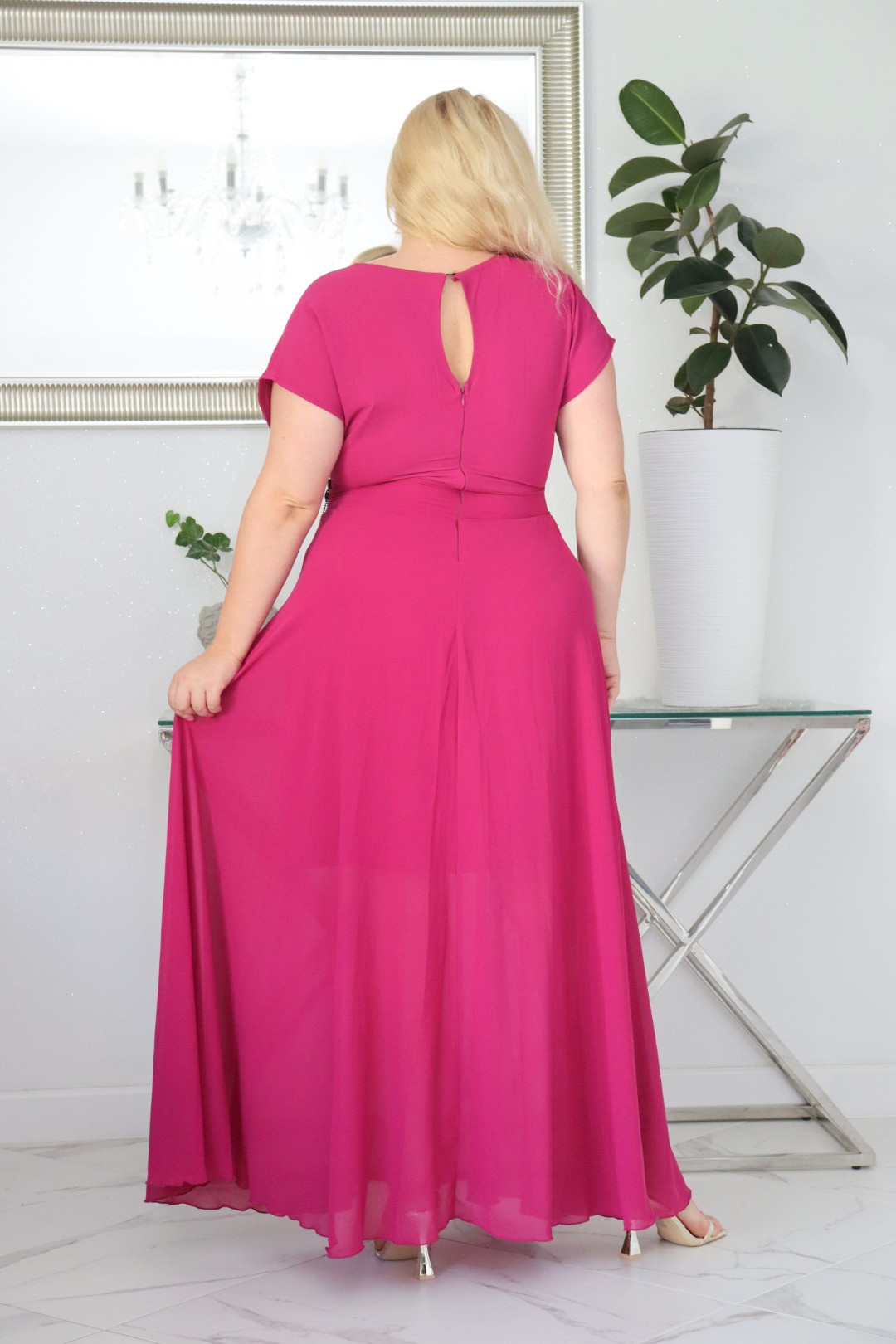 🇵🇱 Polski ProduktSukienka MELISA rozkloszowana long wieczorowa dekolt zakładki FUKSJA