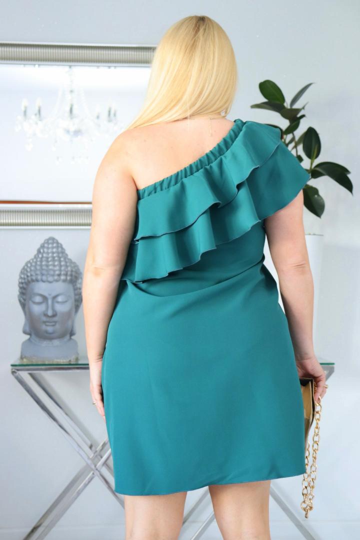 Sukienka ma unikalny fason z dwiema falbankami i na jedno ramię, co wyróżnia ją spośród innych. Taki design sprawia, że jest to niepowtarzalny element garderoby, idealny dla kobiet ceniących oryginalność. Asymetryczny dekolt podkreśla szyję i ramiona, dodając stylizacji lekkości i kobiecości. Jest to idealny wybór dla osób, które chcą wyglądać stylowo i elegancko, nie rezygnując z nowoczesnego charakteru.