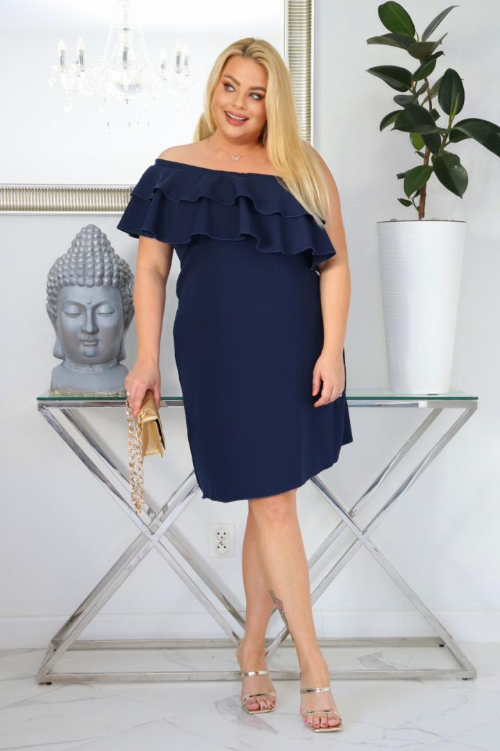 Sukienka urzeka klasyczną elegancją i minimalizmem, co czyni ją ponadczasową. Dwie delikatne falbany dodają jej uroku, nie przytłaczając całości, a trapezowy krój podkreśla atuty sylwetki, jednocześnie ukrywając jej ewentualne mankamenty. Prosty fason sprawia, że jest ona bazą do wielu stylizacji. Subtelny dekolt na jedno ramię dodaje jej oryginalności i nowoczesnego charakteru, idealnie łącząc klasykę z nutą modowego trendu.