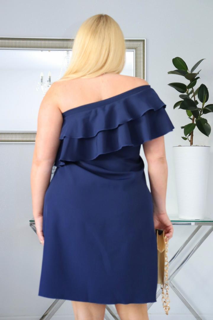 Sukienka ma unikalny fason z dwiema falbankami i na jedno ramię, co wyróżnia ją spośród innych. Taki design sprawia, że jest to niepowtarzalny element garderoby, idealny dla kobiet ceniących oryginalność. Asymetryczny dekolt podkreśla szyję i ramiona, dodając stylizacji lekkości i kobiecości. Jest to idealny wybór dla osób, które chcą wyglądać stylowo i elegancko, nie rezygnując z nowoczesnego charakteru.