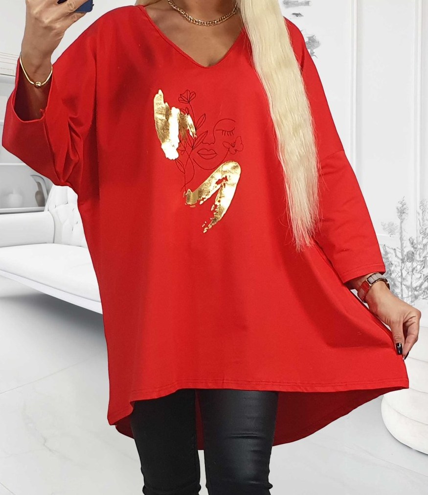 🇵🇱 Polski ProduktTunika BLUZA bawełna 100% czerwona z zarysem twarzy